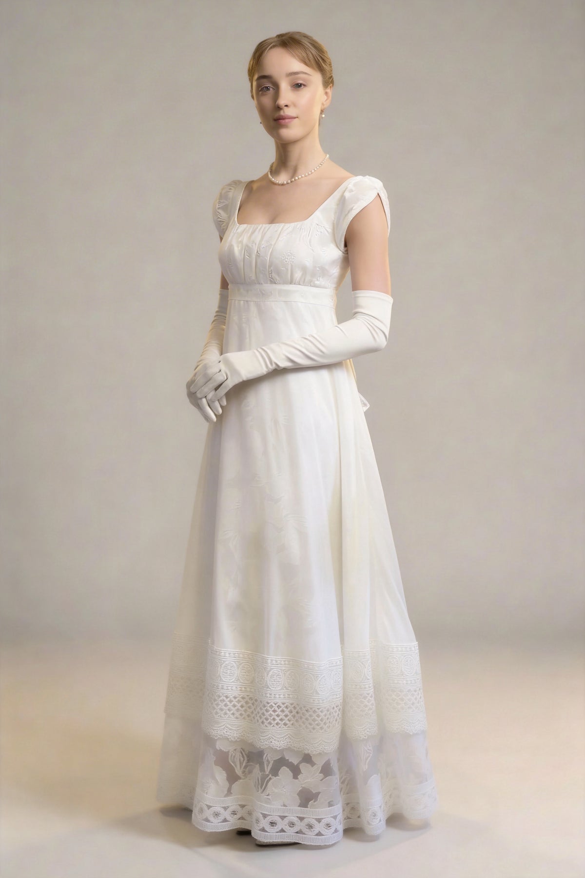 • Timeless Design: This dress features a classic Regency silhouette with gently puffed sleeves and a flowing skirt. The intricate lace detailing adds a touch of romantic charm, enhancing the overall elegance of the gown.