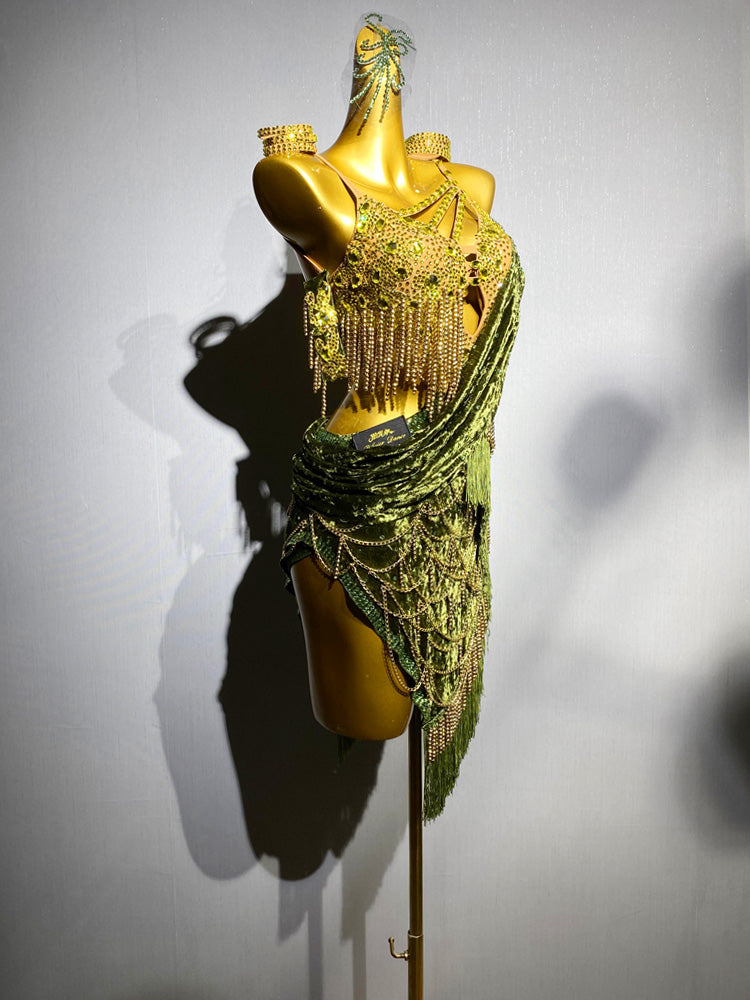 This green Latin fringe dress is a true celebration of rhythm, strength, and style. Designed with a sculpted bodice and dramatic velvet drape, it features dazzling rhinestones, cascading gold bead chains, and layered fringe that moves like liquid with every beat.