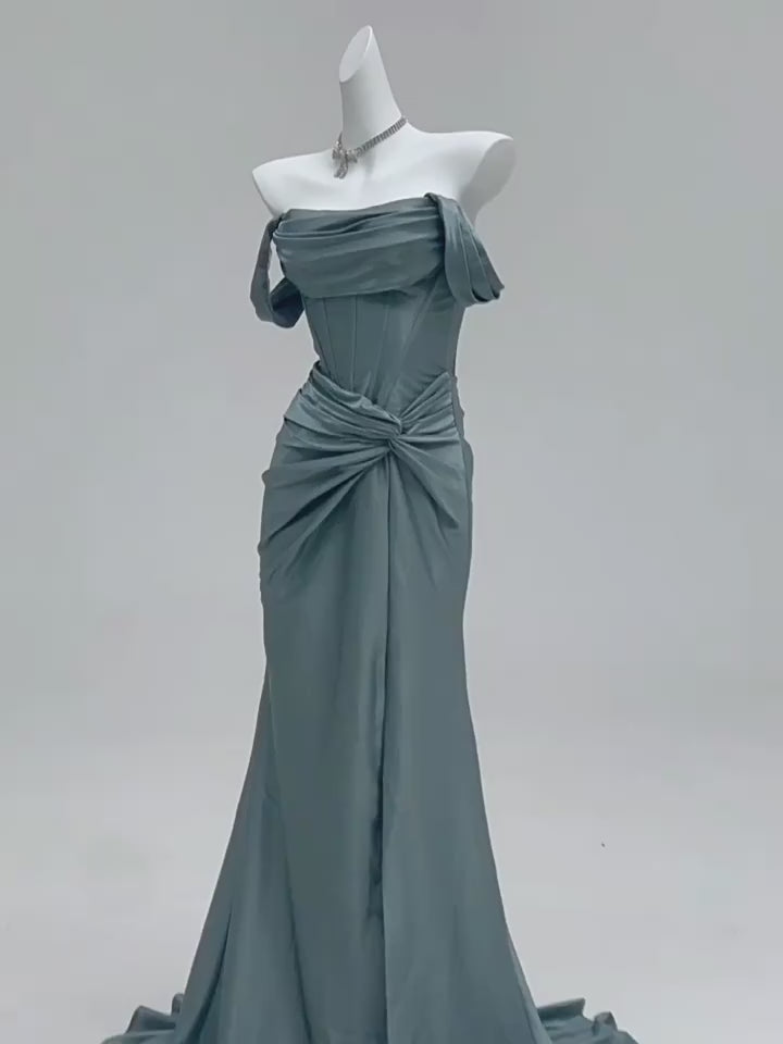 Discover the epitome of elegance with our Steel Blue Silk Evening Dress, designed for those who seek a blend of classic charm and contemporary allure. This enchanting corset-back wedding dress is crafted from a lustrous silk-like fabric that cascades smoothly down to a graceful train, creating a silhouette that is both striking and flattering. The off-the-shoulder design adds a romantic touch, perfect for highlighting delicate jewelry and a radiant smile. Ideal for weddings, galas, or any prestigious affair, this dress not only promises but delivers a breathtaking presence. Elevate your special day with the sophistication and poise encapsulated in every stitch of this exquisite gown.