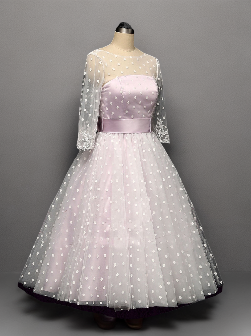 A retro short purple polka dot wedding dress would be a fun and unique choice for a bride looking to make a statement on her special day. This dress features a classic A-line silhouette with an illusion neckline and long sleeves, along with a full skirt in a playful polka dot print. The bodice and skirt are both made from a light purple chiffon fabric, giving the dress a delicate and feminine feel. The dress is finished off with a satin ribbon sash and a bow at the waist for added charm.