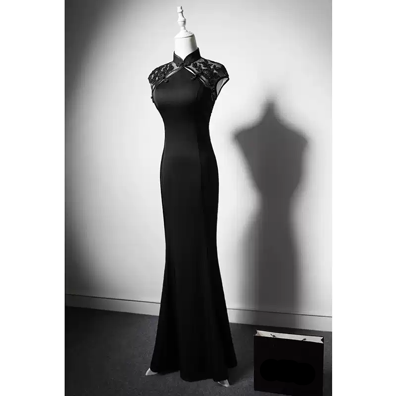 Elevate your elegance with this black cheongsam dress, designed for a sophisticated and timeless appeal. The combination of sheer embroidered lace and a sleek silhouette makes it a statement piece for formal events or evening occasions.