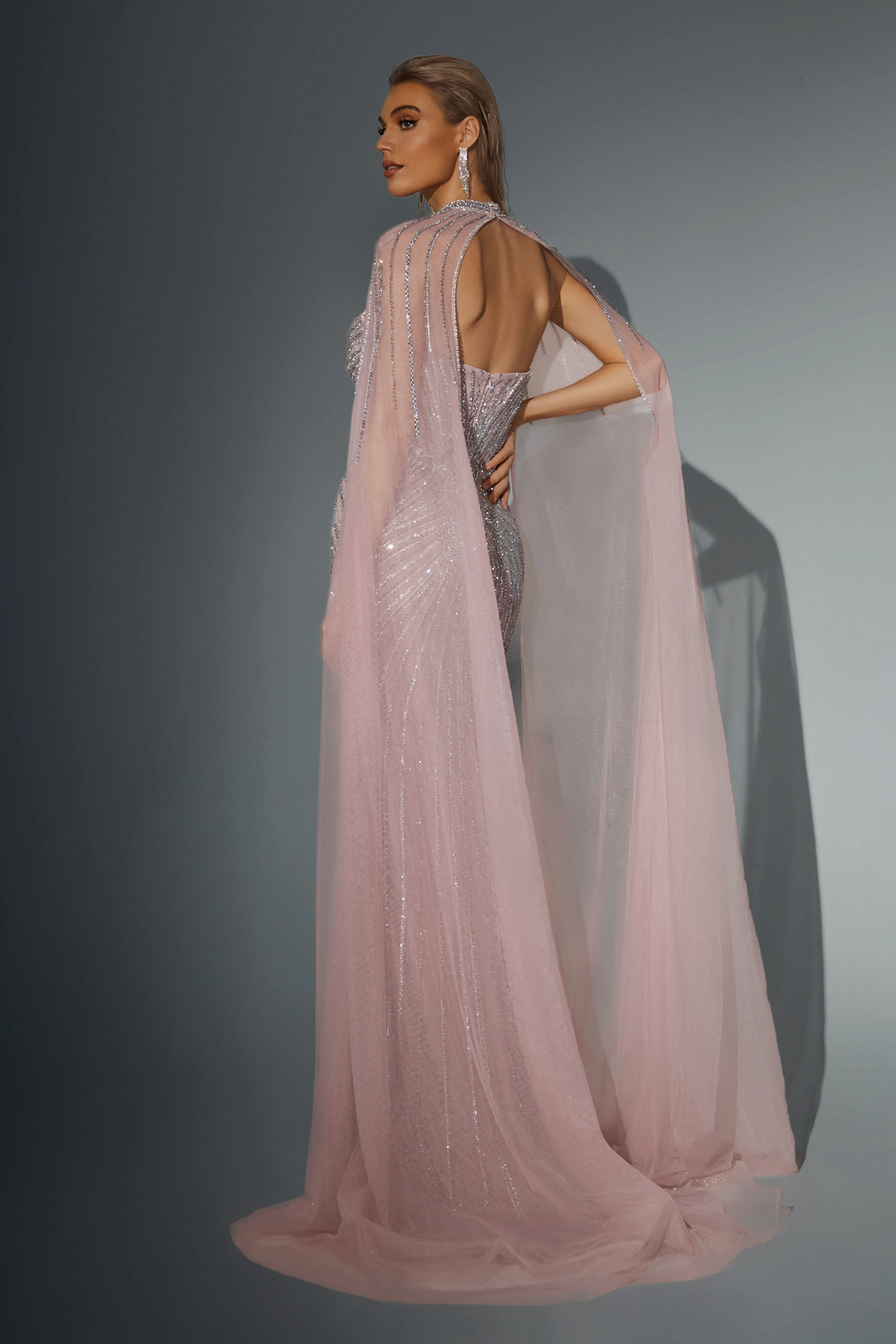 Elevate your evening elegance with this Blush Pink Sequin Evening Gown, a masterpiece of refined design and dazzling details. The flowing cape sleeves add a regal flair, while the high neckline exudes sophistication and modern grace. Crafted with intricate sequin embellishments, this gown sparkles with every movement, creating a show-stopping effect. The tailored fit enhances your curves beautifully, and the mermaid silhouette provides a timeless, flattering shape. Whether for a gala, prom, or any grand occasion, this gown ensures you'll make a memorable entrance. Perfect for embracing glamour and confidence in plus size style.