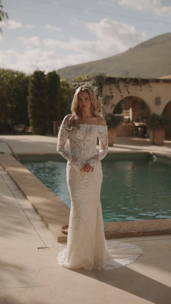 Effortlessly romantic, this nude lace off-shoulder wedding dress is a modern take on classic elegance. Designed with a sheer corset bodice and soft lace detailing, the dress features delicate embellishments that shimmer subtly in the light. The detachable sleeves offer two looks in one—wear them for a graceful ceremony and remove them for a more relaxed reception style.