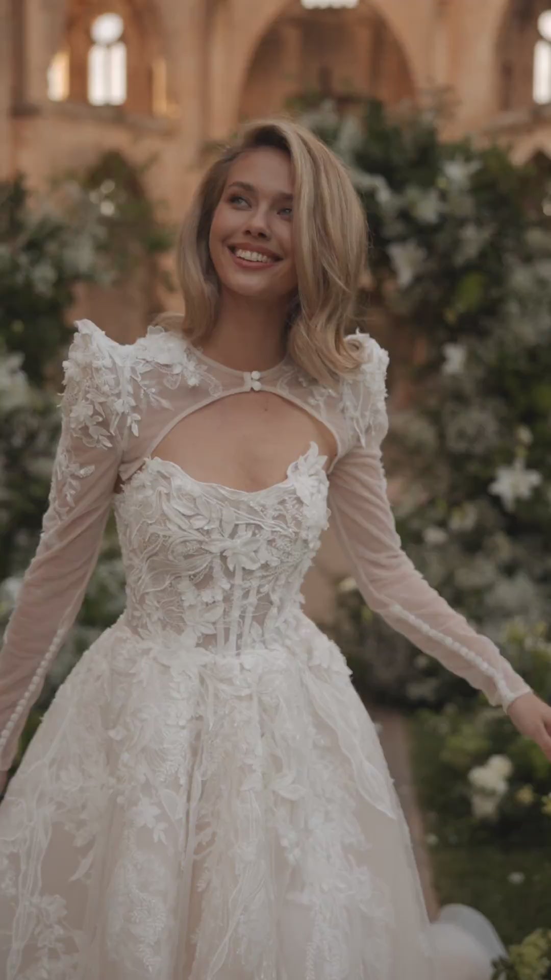 Make an unforgettable entrance in this nude long sleeve wedding dress, designed to embody romance and refined luxury. The gown features a structured corset bodice with delicate floral lace appliqué that cascades seamlessly into a soft, flowing tulle skirt. Its illusion neckline and sheer long sleeves offer a sophisticated, ethereal touch—perfect for brides who crave elegance with a twist.