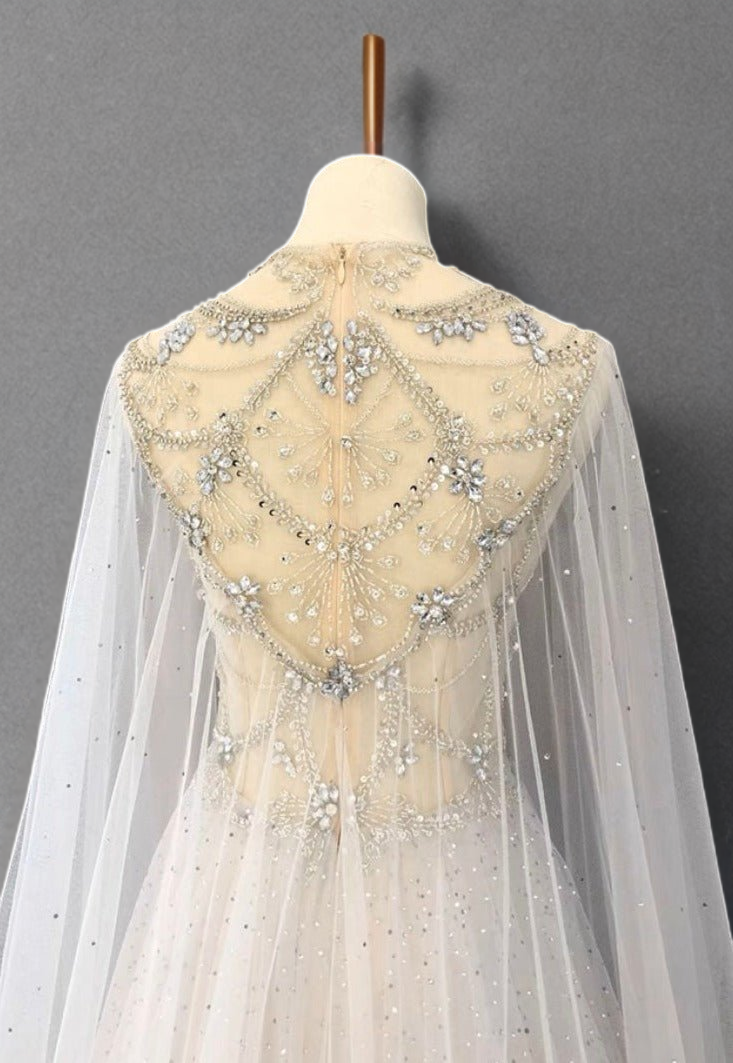 Crafted with intricate beadwork and delicate embellishments, this dress sparkles with every movement, creating a magical aura that will captivate all who see you. The flowing tulle skirt adds an ethereal touch, while the matching embellished cape adds an extra layer of elegance and drama.