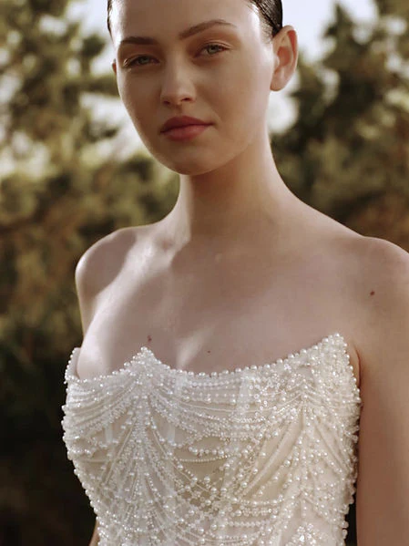 • Beaded Corset with Pearl Embroidery: The stunning corset is adorned with intricate beadwork and lustrous pearls, adding a touch of luxury and enhancing the bride's figure.