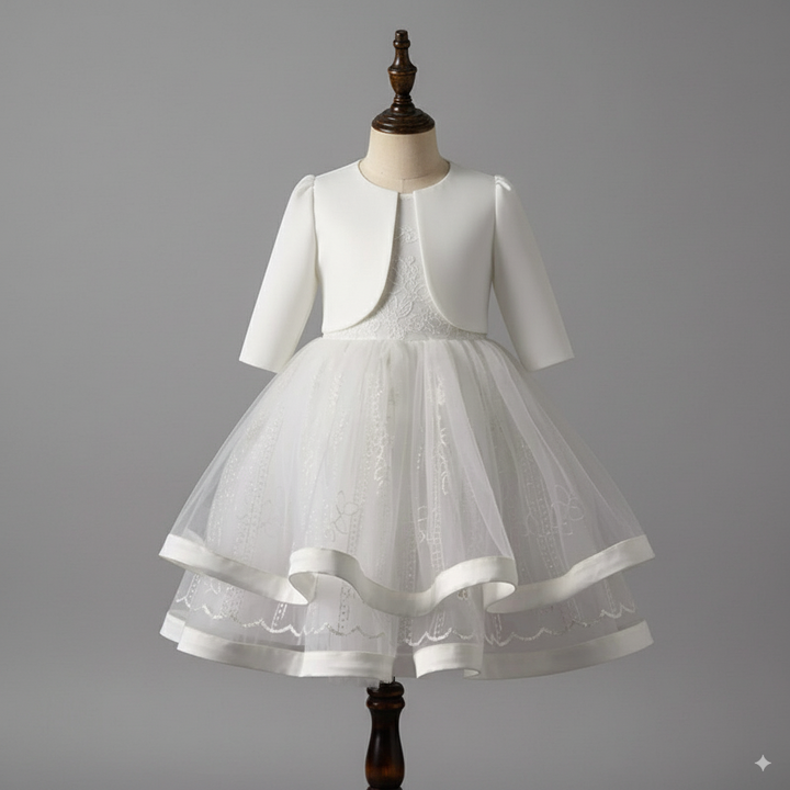 This exquisite two-piece flower girl dress combines timeless elegance with thoughtful design, making it a perfect choice for weddings and special occasions. The set includes a delicate bolero jacket and a layered tulle dress, offering both versatility and charm.