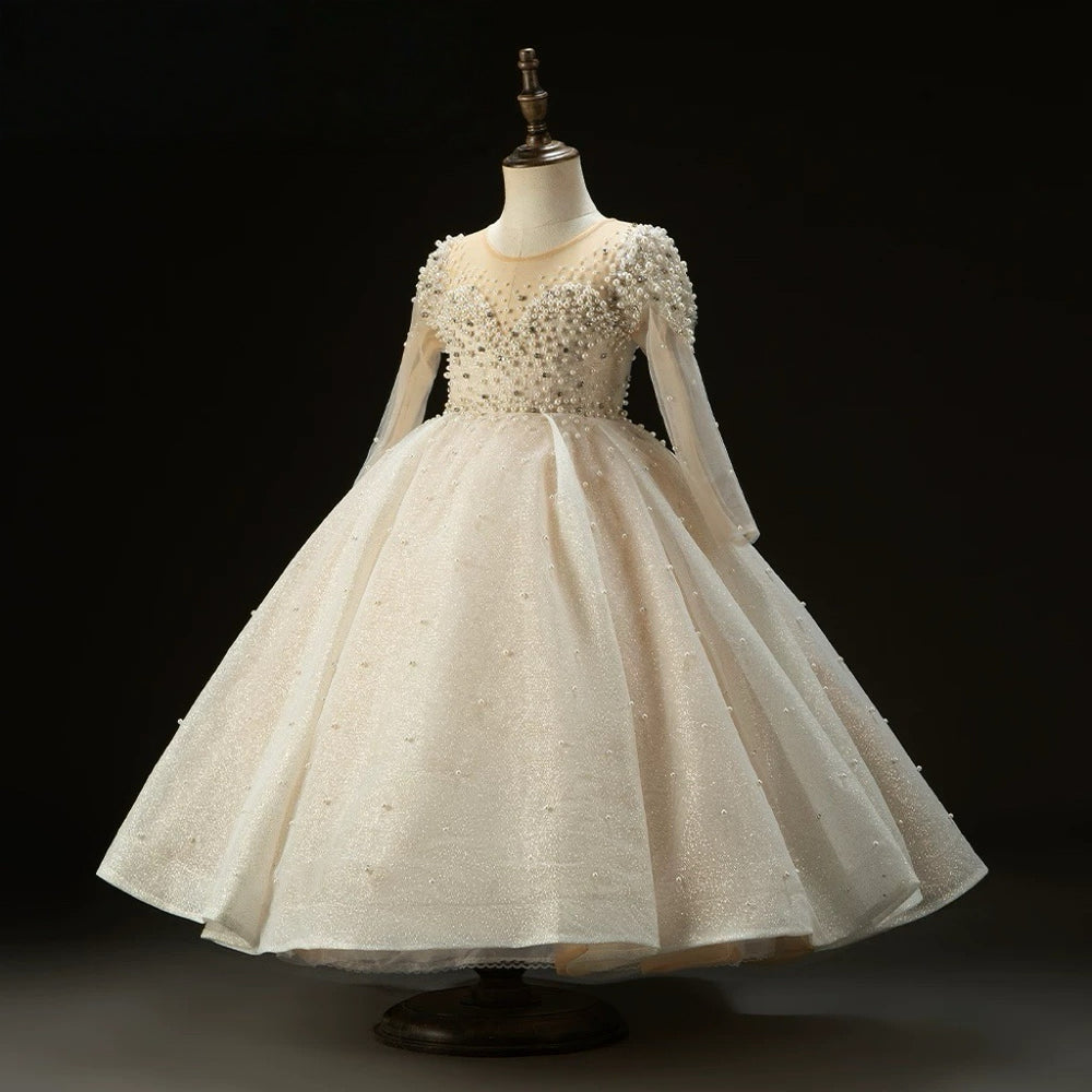 Create an unforgettable look with this champagne tulle flower girl dress with pearl details, a gown that radiates elegance and charm. The long-sleeve bodice is delicately adorned with pearls, offering a refined sparkle, while the full layered tulle skirt adds graceful movement and fairy-tale volume. Designed with a lace-up back, the fit is adjustable to ensure comfort throughout weddings, pageants, and formal portraits.