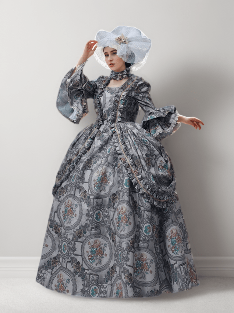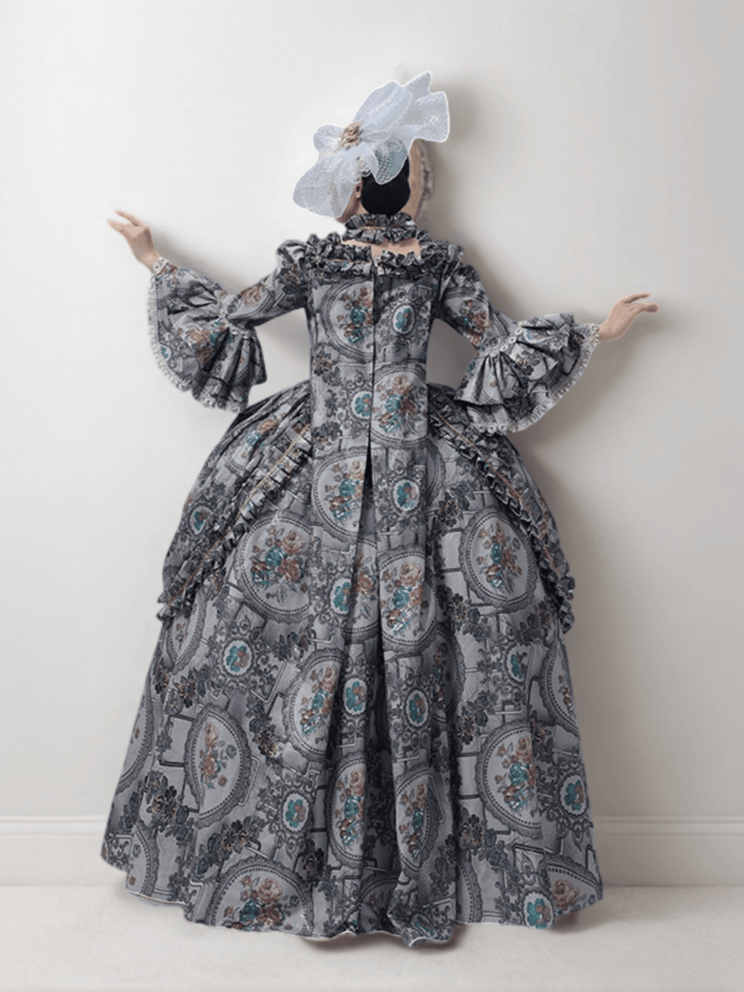 Majestic Grey Rococo Style Dress – Exquisite Baroque Print Ball Gown with Lace Detailing Plus Size - WonderlandByLilian