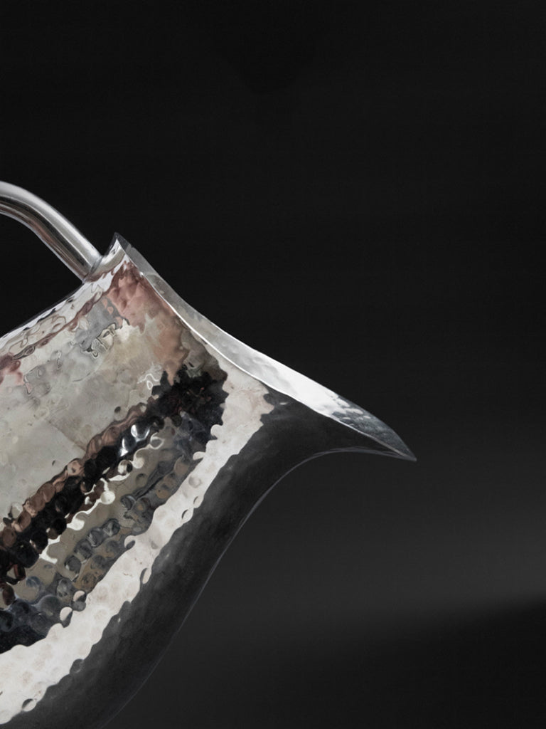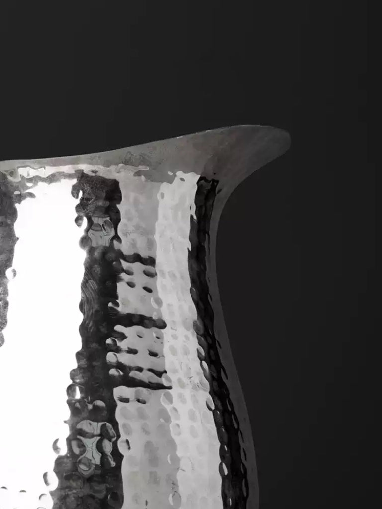 Crafted with timeless artistry, this authentic Indian pitcher vase is forged from solid brass and finished with a refined layer of silver chrome, echoing the heritage of Georg J–inspired designs. Each hammered mark is meticulously shaped by hand, carrying the rhythm of countless strikes, making every piece one-of-a-kind.