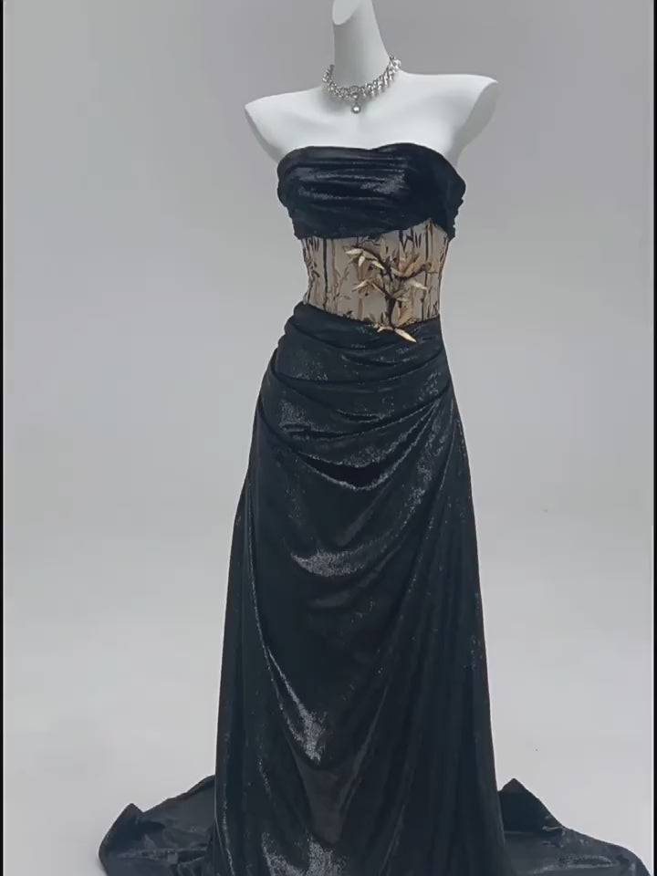 Step into a world of dramatic elegance with our Gothic Black Wedding Dress, a masterpiece designed for the modern woman who embraces a touch of the unconventional. This gown features a luxurious black velvet body that hugs your curves delicately, complemented by a corset back that ensures a perfect, custom fit. The true allure lies in the striking metallic accents that weave through the corset, shimmering with every movement and catching the eye with their intricate detailing.