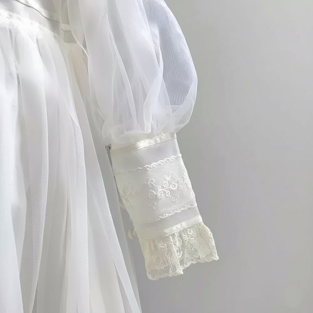 Echoing the soft glow of vintage childhood, this Victorian lace dress in a gentle milky-almond hue captures the romantic spirit of Gunne Sax nostalgia. The design features a high lace collar, puffed long sleeves, and a flowing tiered skirt trimmed with delicate lace—each detail telling a story of innocence and quiet grace.