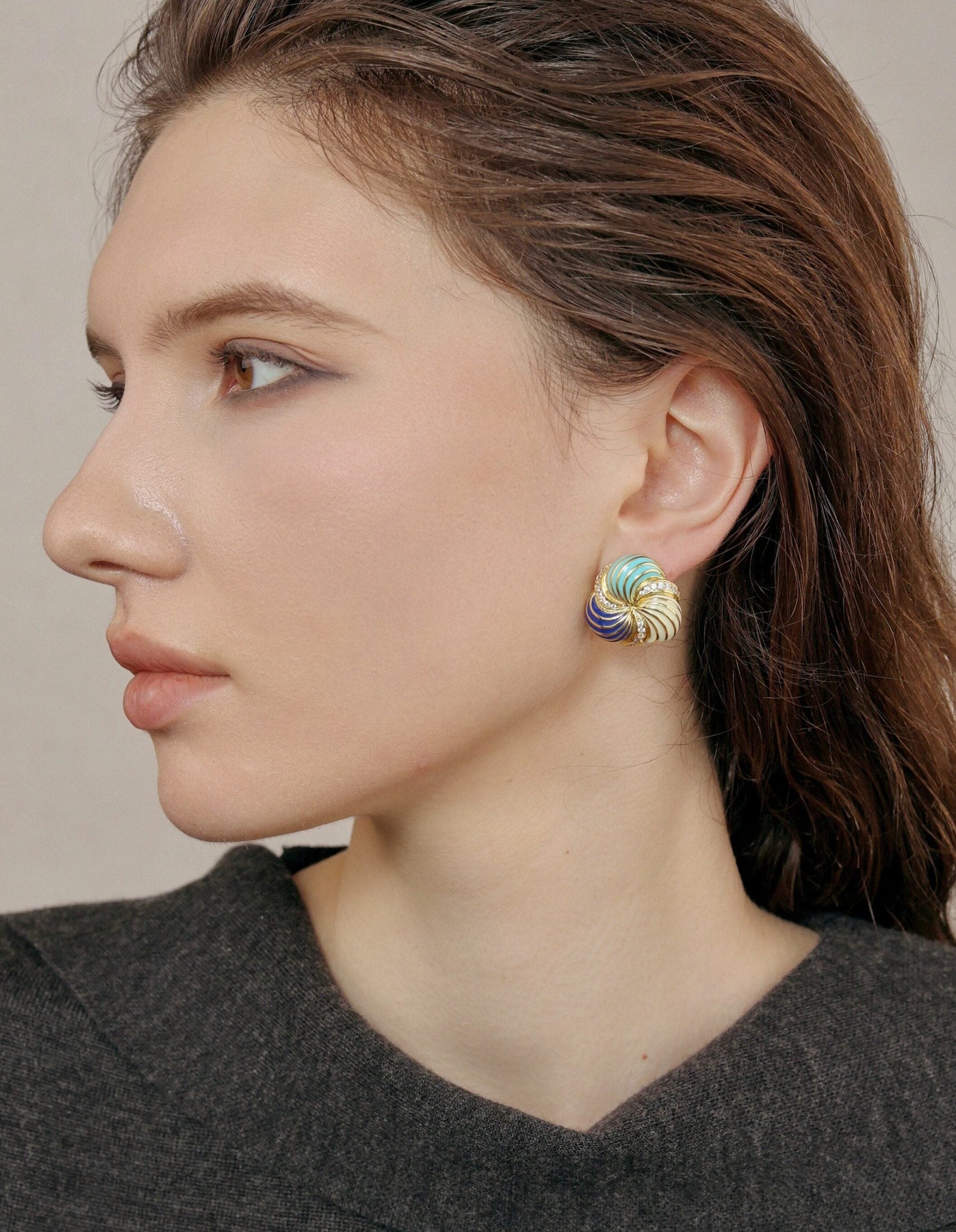 Inspired by the coastal rhythm of Valencia, Azure Spiral captures the movement of sea and sky in a sculpted swirl. Hand-painted enamel in royal blue, ocean turquoise, and soft ivory curves inward like waves folding into one another. Delicate crystal accents glimmer between the arcs, adding a subtle brilliance against the warm vintage gold setting.