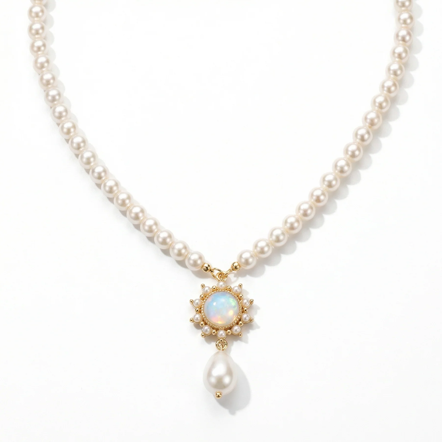 Delicate and luminous, Celestial Pearl captures the quiet beauty of moonlight resting upon a strand of pearls. A graceful row of ivory pearls forms the necklace, leading to a radiant centerpiece where a glowing opalescent stone is framed by tiny pearls like a miniature halo of light. Suspended beneath, a soft teardrop pearl sways gently, adding movement and timeless elegance.