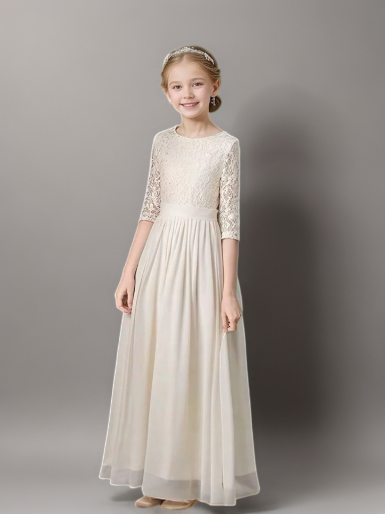 This champagne flower girl dress combines timeless lace with graceful chiffon for a sophisticated look. The fitted lace bodice with half sleeves adds elegance, while the flowing chiffon skirt creates a light and airy silhouette perfect for walking down the aisle or attending formal celebrations. Designed for comfort and style, this dress is ideal for weddings, parties, or any special occasion.