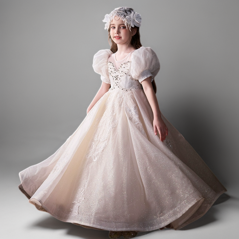 This champagne puff sleeve flower girl dress is a fairytale dream for special occasions. The gown features a delicate beaded bodice with shimmering details that add elegance and sparkle. Its voluminous puff sleeves create a regal silhouette, while the full lace-embellished tulle skirt flows gracefully with every step.