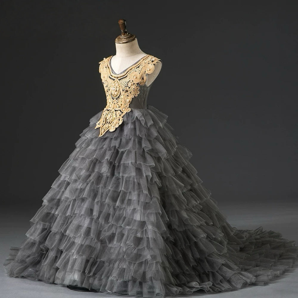 Step into timeless elegance with this grey and gold lace flower girl dress, a gown that blends sophistication with fairy-tale charm. The bodice features exquisite golden embroidery with lace accents, creating a regal focal point, while the skirt cascades in soft layers of grey tulle for a voluminous and graceful silhouette. A flowing train at the back adds drama and beauty, making this gown ideal for weddings, pageants, and formal portraits.