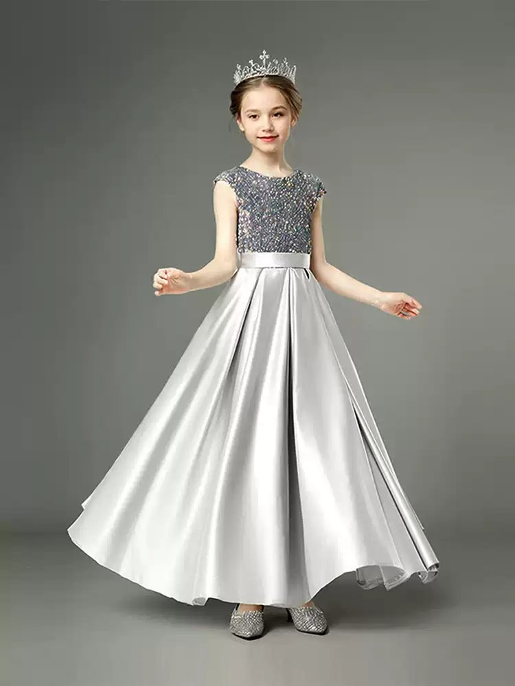 This grey satin flower girl dress with glitter bodice is the epitome of sparkle and elegance for weddings, pageants, and milestone celebrations. The shimmering sequined top catches the light beautifully, while the soft satin skirt flows in graceful pleats. A statement bow at the back completes the look with a touch of timeless charm.
