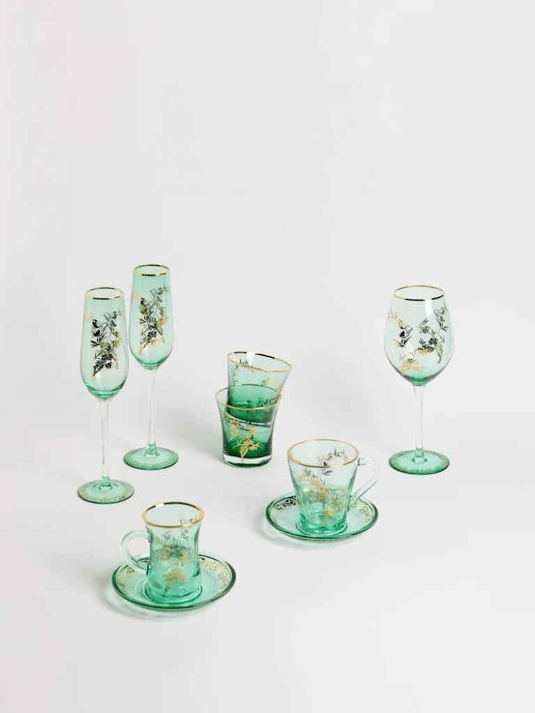 This exquisite 200ml glass cup combines delicate artistry with timeless craftsmanship. Featuring a subtle green tint adorned with hand-painted golden floral details, each piece reflects the elegance of Venetian glassmaking traditions. The refined gilded rim elevates its design, adding a luxurious accent to your daily rituals.
