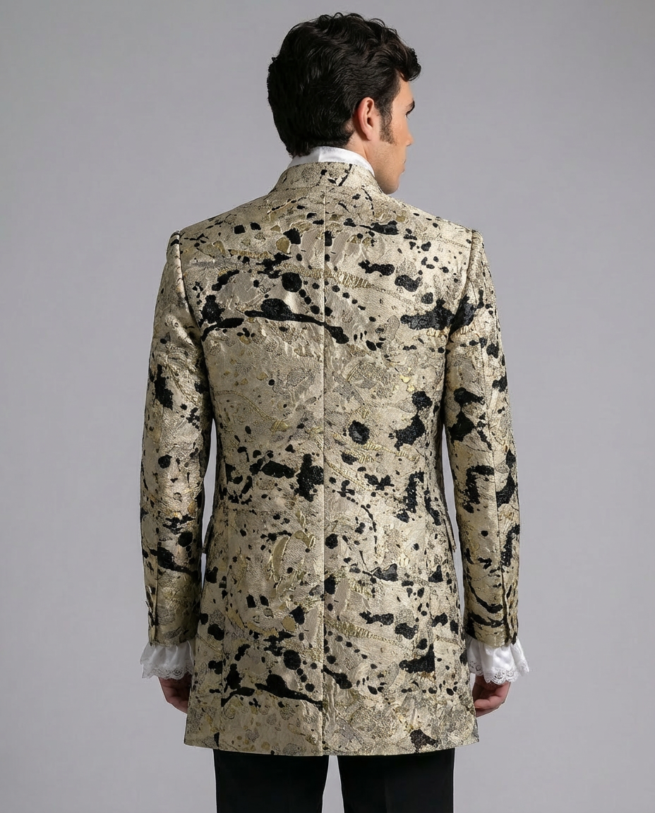Blending aristocratic heritage with artistic modern expression, this Bridgerton inspired abstract jacquard Regency jacket is designed for statement formalwear and elevated ceremonial styling. The gold base is layered with artistic dark pattern detailing, creating a contemporary palace aesthetic that feels both historic and fashion forward.