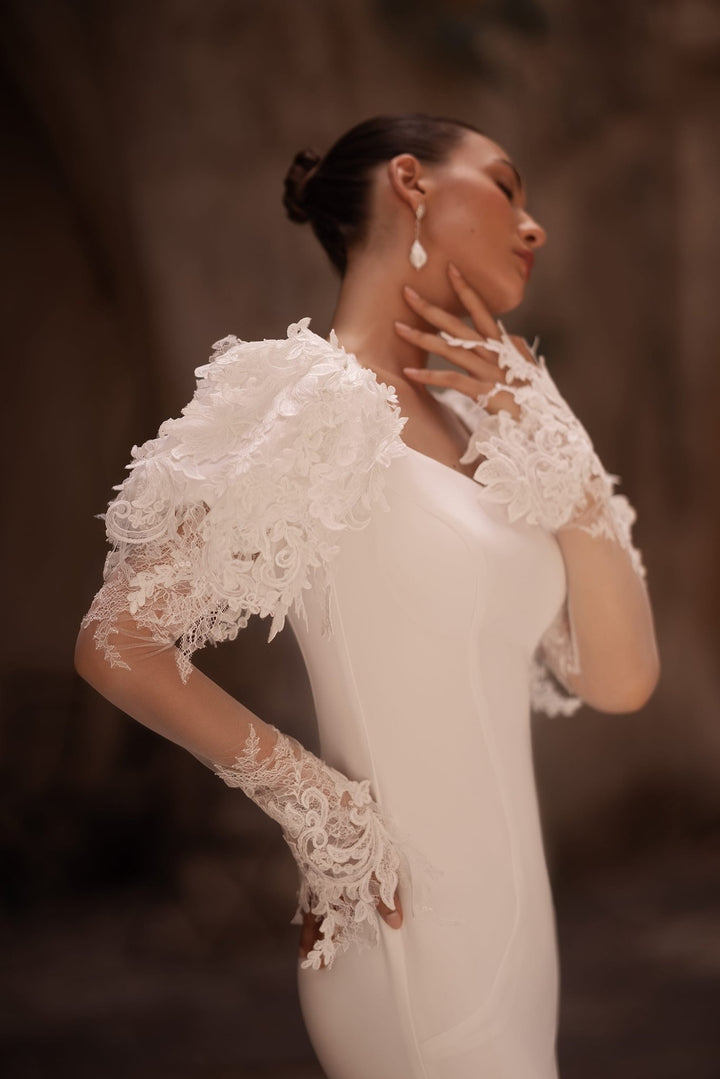 • Scandalous Long Sleeves with Lace: Each sleeve is generously sprinkled with intricate lace detailing, offering a touch of sophistication and a dash of allure to your bridal look.