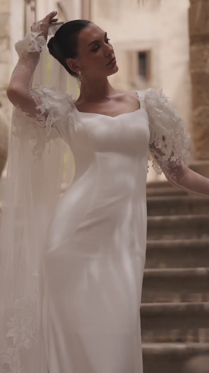• Simple yet Sophisticated Design: The gown's simplicity is its charm, featuring a smooth, flowing ivory fabric that speaks volumes of elegance and understated luxury.