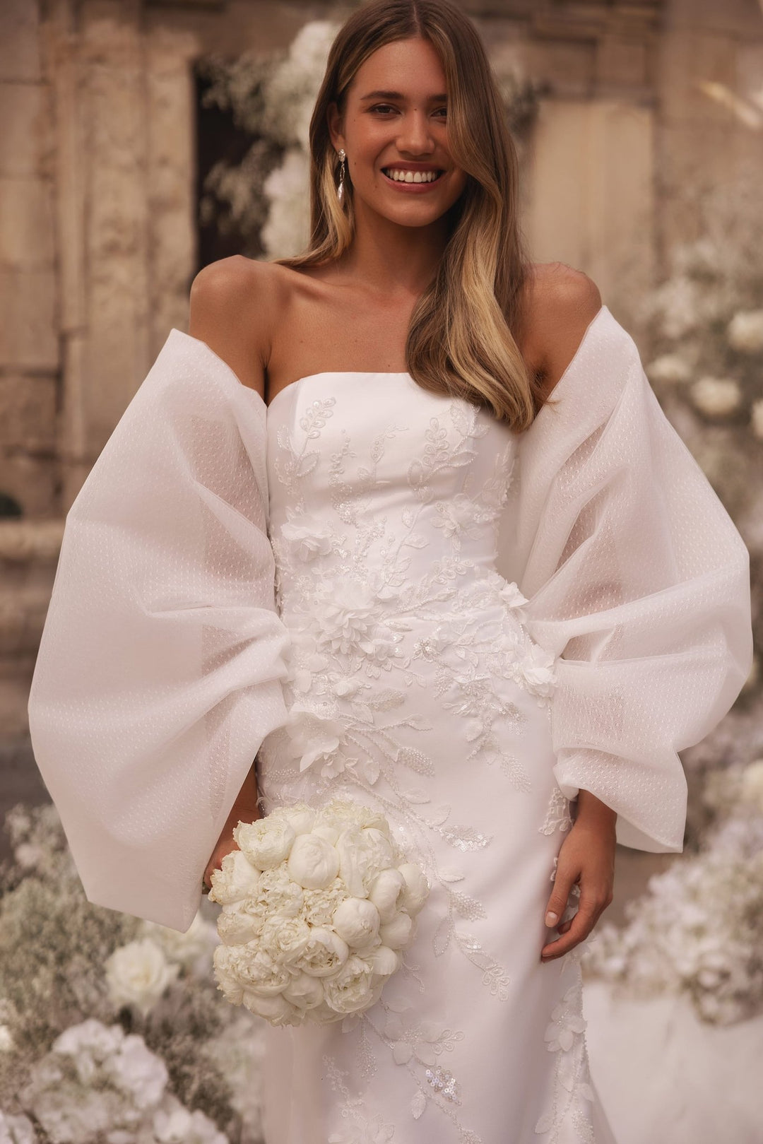 Captivate your audience with this enchanting ivory wedding dress, expertly designed to showcase your elegance and charm. The sophisticated dress elegantly drapes around your body, accentuating your figure with its sleek, form-fitting silhouette. Adorned with delicate floral sequins, this gown brings a touch of sparkle and enchantment to your special day.