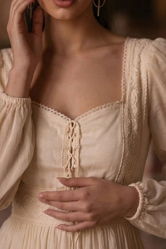 A softly structured square neckline, gentle front lacing, and billowed long sleeves create a graceful, feminine silhouette. The full pleated skirt flows into a layered lace hem, offering dramatic yet weightless movement. Our upgraded fabric introduces a richer drape and more refined structure, elevating the traditional prairie wedding dress into a more luminous and sculpted form.