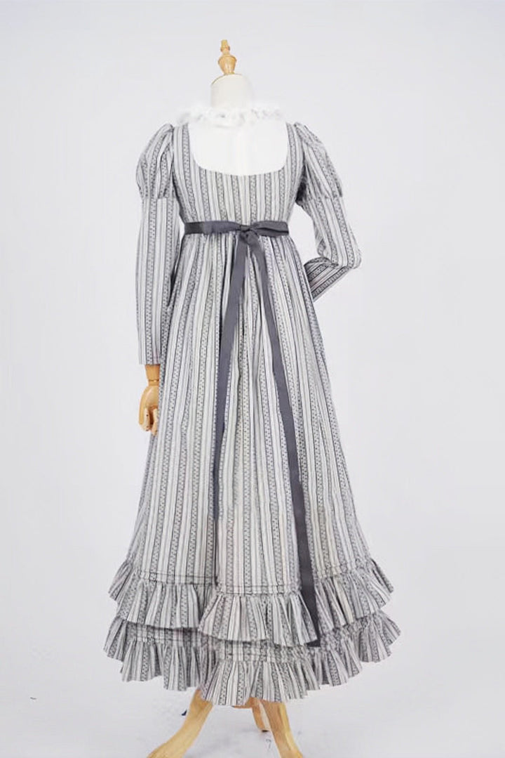 Bridgerton Inspired Regency Era High-necked Grey Striped Dress - Regency Era Ball Gown Plus Size - WonderlandByLilian