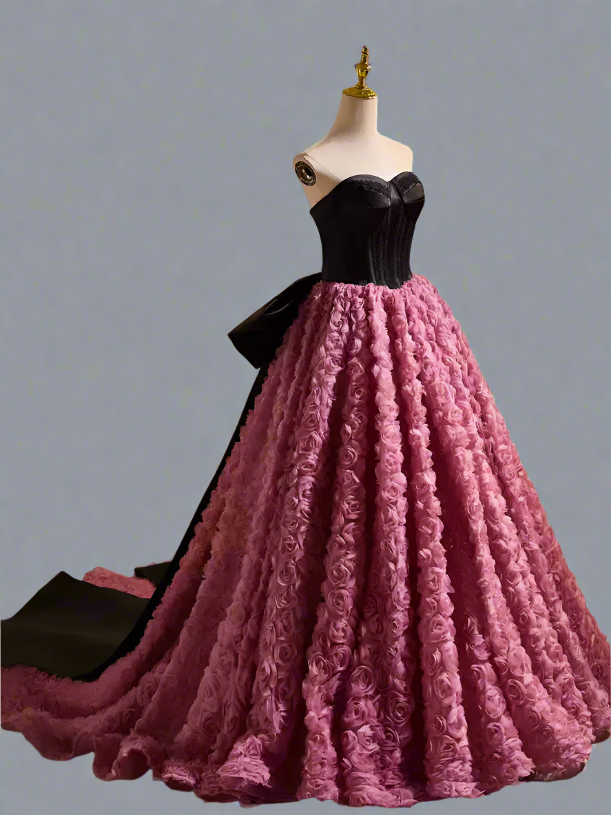 Gothic Black and Pink Ball Gown with Sweetheart Neckline - 3D Rose Dress with Strapless -  Pink and Black Floral Ball Gown with Oversized Bow Plus Size