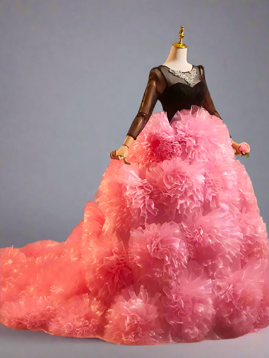 Gothic Black Floral Ball Gown with Pink Ruffle Skirt - Layered Tulle Ruffle Dress -  Long-Sleeve Evening Dress Plus Size