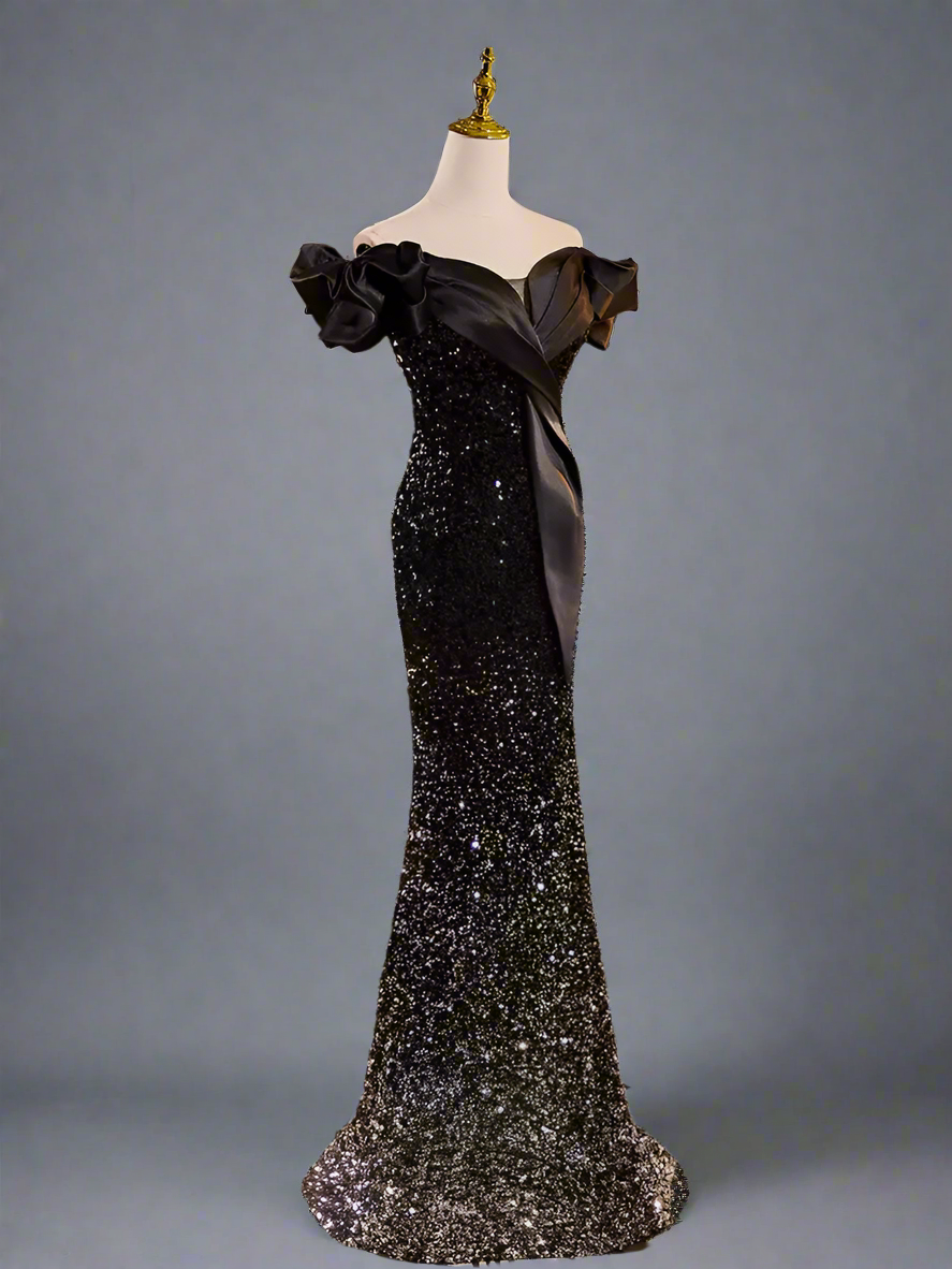 Gothic Black Tight-Gitted Prom Dress with Sequins - Mermaid Dress Evening Gown with Sparkling Detail - Off the Shoulder Dress Plus Size