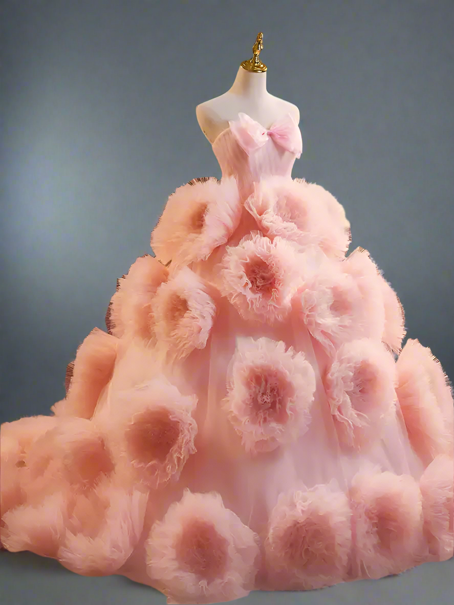 Pink Floral Ball Gown with 3D Rose Detail - 3d Rose Dress with Boe Neckline - Strapless Wedding Dress with Tulle Skirt Plus Size