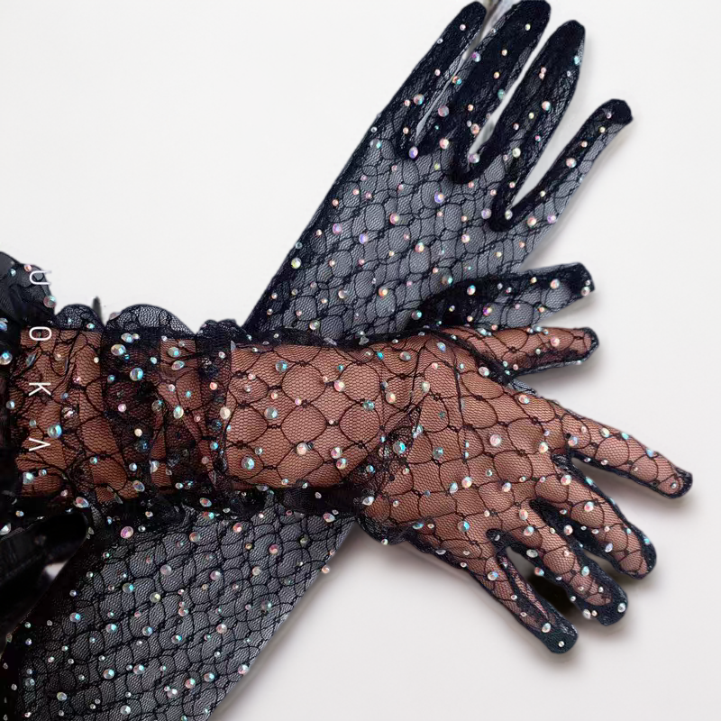 Black Mesh Bridal Gloves with Rhinestone Embellishments - Sparkling Wedding Accessory