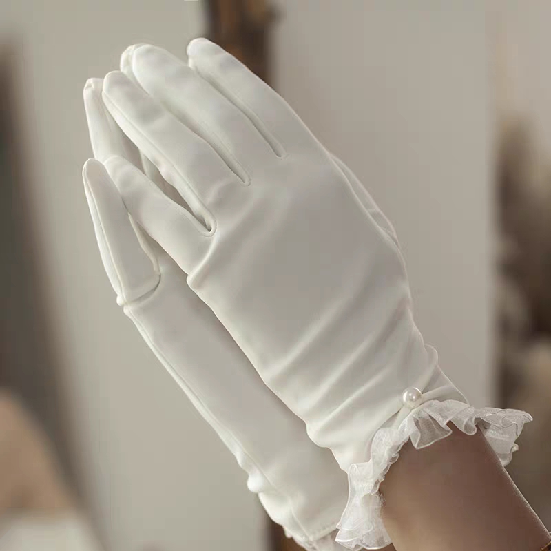 Classic Satin Bridal Gloves with Pearl and Lace Ruffle Cuff - Timeless Wedding Accessory