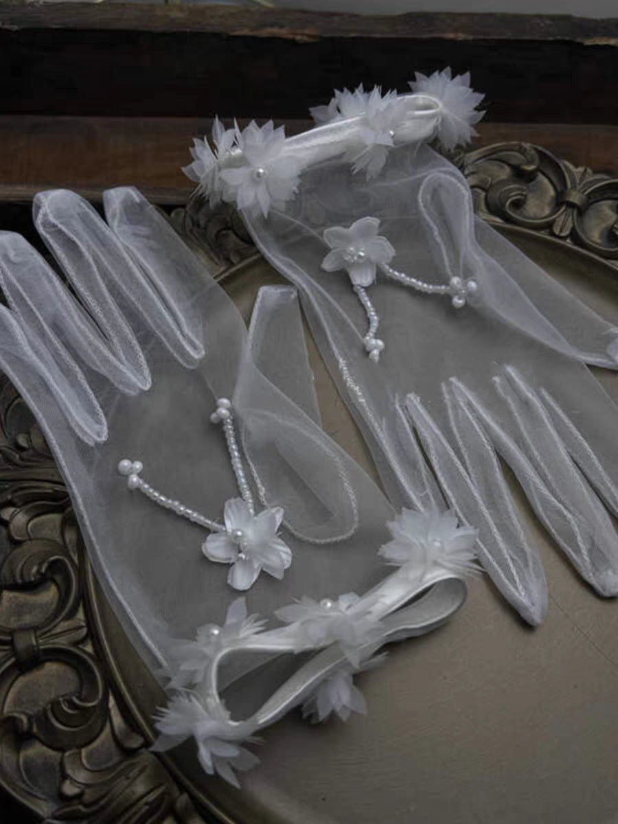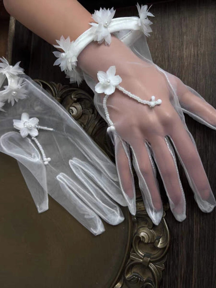 Enhance your bridal look with these exquisite sheer gloves, beautifully adorned with floral appliqués and delicate pearl accents. Each glove features intricate flower details along the wrist and a charming pearl bow for an added touch of elegance. The extended length and transparent tulle offer a soft, romantic aesthetic, perfect for wedding ceremonies or special occasions. These gloves are designed to complement bridal gowns with grace, adding a layer of sophistication that is both timeless and enchanting.