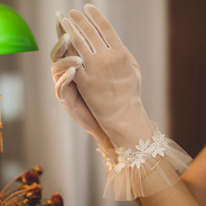 These delicate sheer bridal gloves feature soft tulle ruffle cuffs adorned with floral appliqué, adding a touch of grace and romance to your wedding ensemble. The gentle transparency of the fabric lends a light, airy look, while the intricate floral details bring a subtle elegance. Perfect for brides looking to add a refined and feminine touch to their attire, these gloves effortlessly enhance a variety of bridal styles, making them a charming accessory for a memorable day.