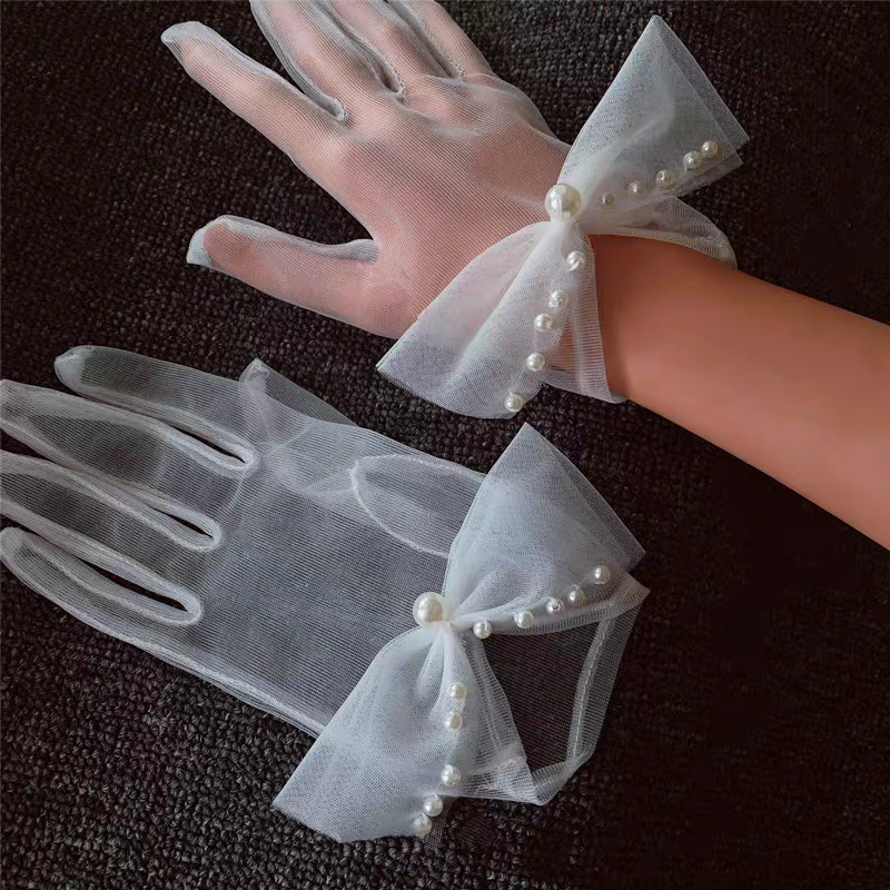Sheer Tulle Bridal Gloves with Pearl-Embellished Bows - Elegant Wedding Gloves