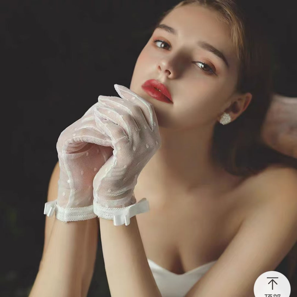 Add a touch of vintage charm to your wedding day with these beautiful white polka dot mesh gloves. Designed with a soft, sheer mesh fabric, these gloves feature delicate white polka dots that exude timeless elegance. The elegant bow detail at the wrist enhances the overall sophistication, making these gloves a perfect accessory for brides who want a unique and refined addition to their bridal ensemble. Ideal for both classic and contemporary wedding styles, these gloves are sure to elevate your look with subtle grace.