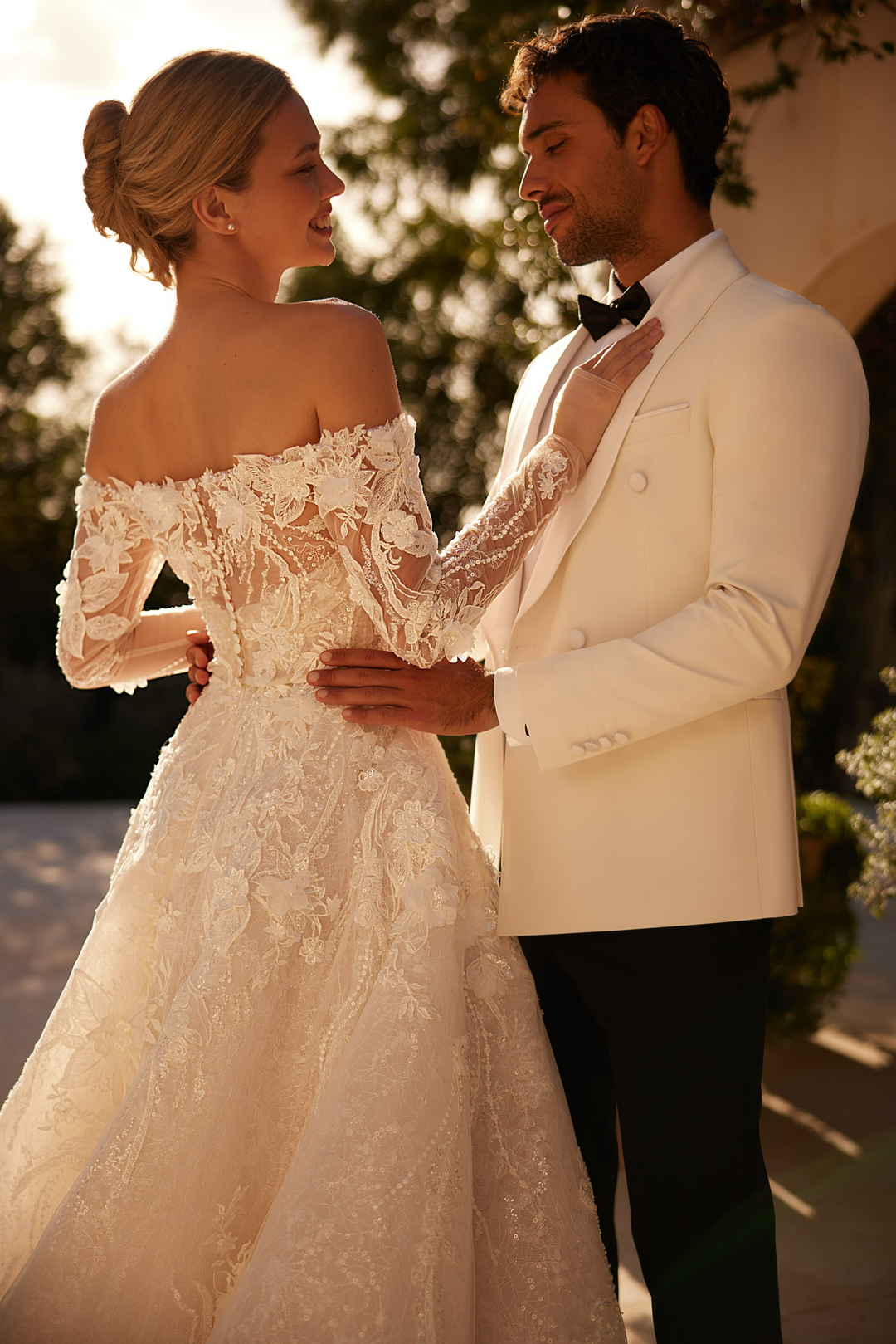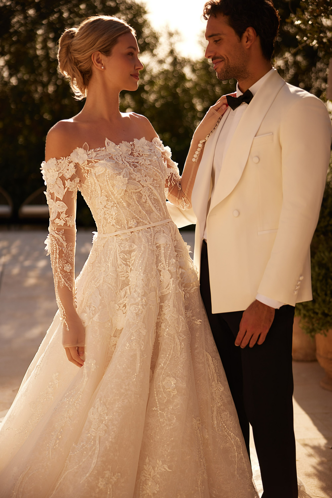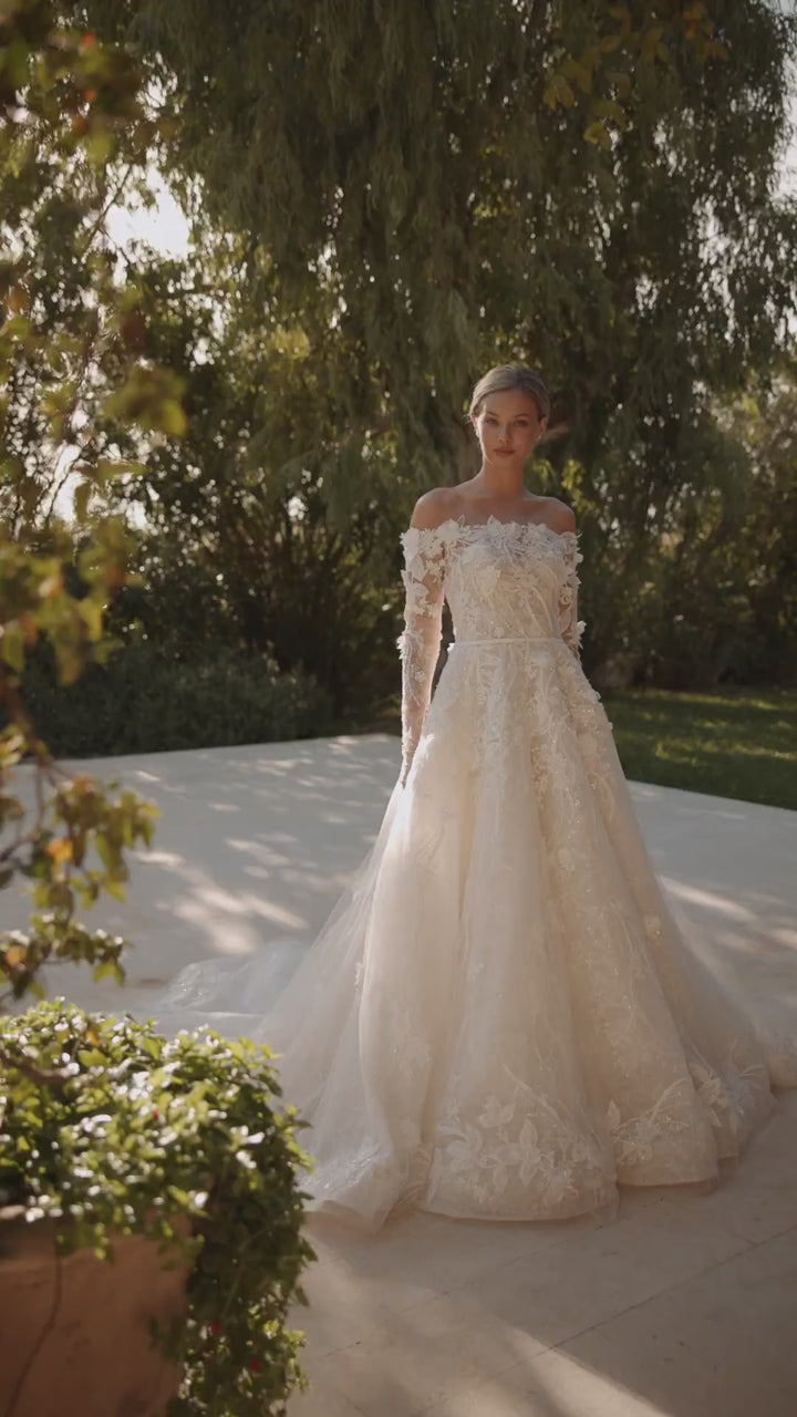 Gracefully romantic and effortlessly refined, this nude off shoulder wedding dress is designed to make a lasting impression. Adorned with intricate embellishments and a delicately structured lace bodice, this gown brings together modern sensuality and classic elegance. The soft nude underlay enhances the detail of the floral embroidery, creating a dreamy, dimensional effect.