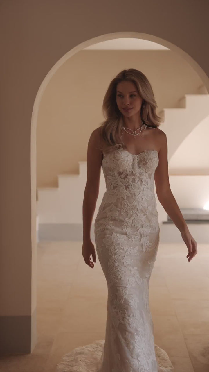 Turn heads in this nude strapless wedding dress, crafted for the bride who loves romance with a touch of allure. The figure-hugging silhouette features a sculpted lace bodice and soft nude lining, creating a modern, feminine shape that feels both elegant and sexy.