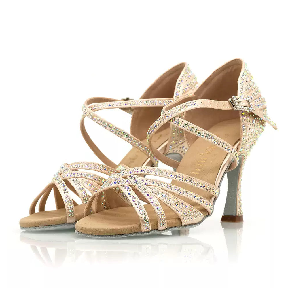 Handmade with exquisite craftsmanship, these pink salsa heels feature a shimmering silk satin upper embellished with radiant rhinestones that sparkle with each movement. The open-toe design and elegant criss-cross ankle straps ensure both beauty and secure support on the dance floor.