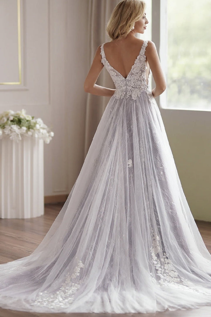 Lavender Plunging-V Beaded Straps Lace Embroidery Wedding Dress - Plus Size - WonderlandByLilian
