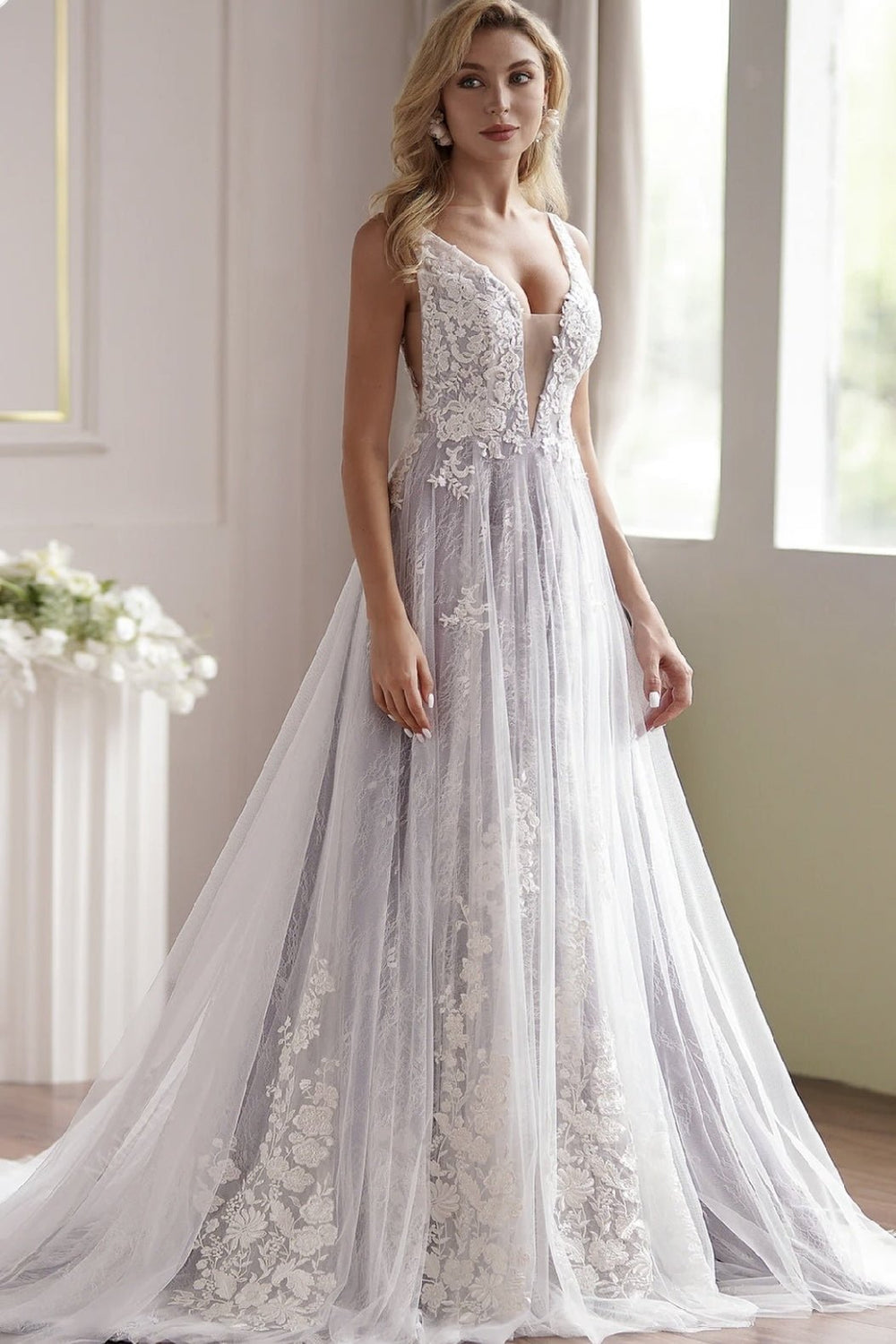 Featuring exquisite floral lace on plunging V-neck bodice with hand-placed beads, and sequins adorned, and a romantic court train A-line skirt with looming finely flower lace underneath illusion tulle with luxurious lace appliqué adored, this lavender wedding dress is a showstopper.