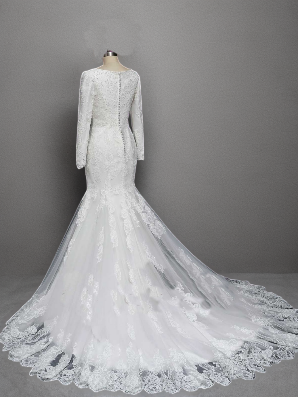 Step into classic elegance with this white lace mermaid wedding dress, designed to captivate with its timeless beauty. The gown features a figure-flattering mermaid silhouette that flows into a dramatic lace-trimmed tulle train, creating a stunning look for your big day. The long sleeves are adorned with intricate lace embroidery, complementing the delicate detailing throughout the gown.