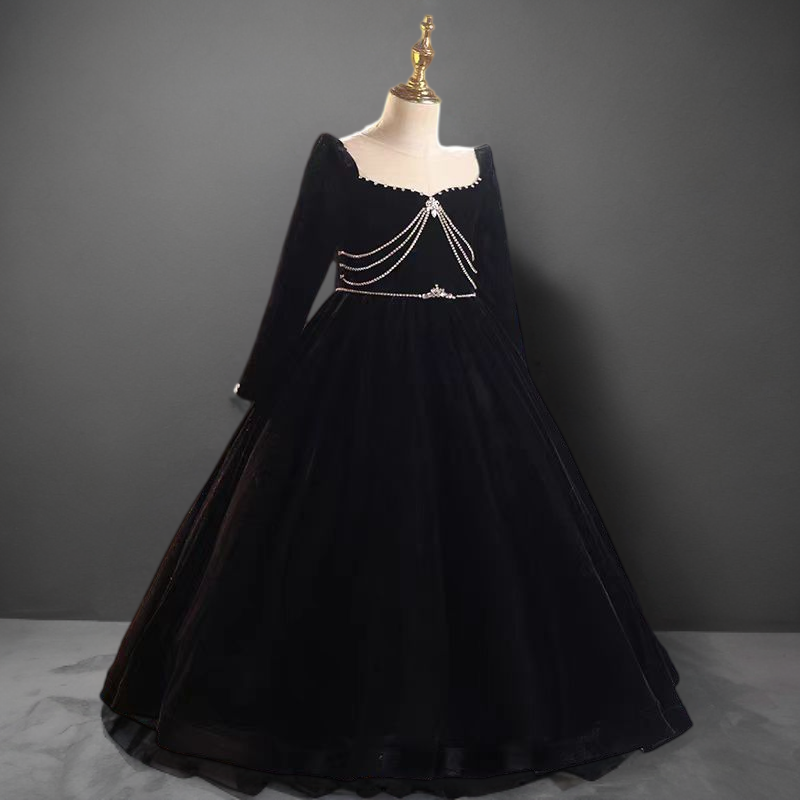 This exquisite black velvet flower girl dress is designed for timeless elegance, featuring luxurious pearl embellishments and a classic long sleeve design. Perfect for formal events such as weddings, this gown brings a sense of sophistication and charm to any special occasion.