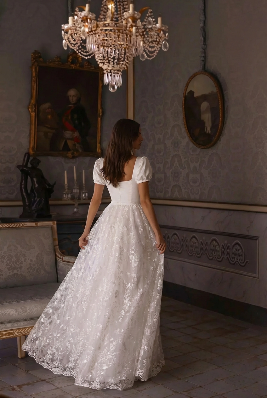 • Puff sleeves lend a delicate and timeless touch, capturing the elegance of Regency fashion.