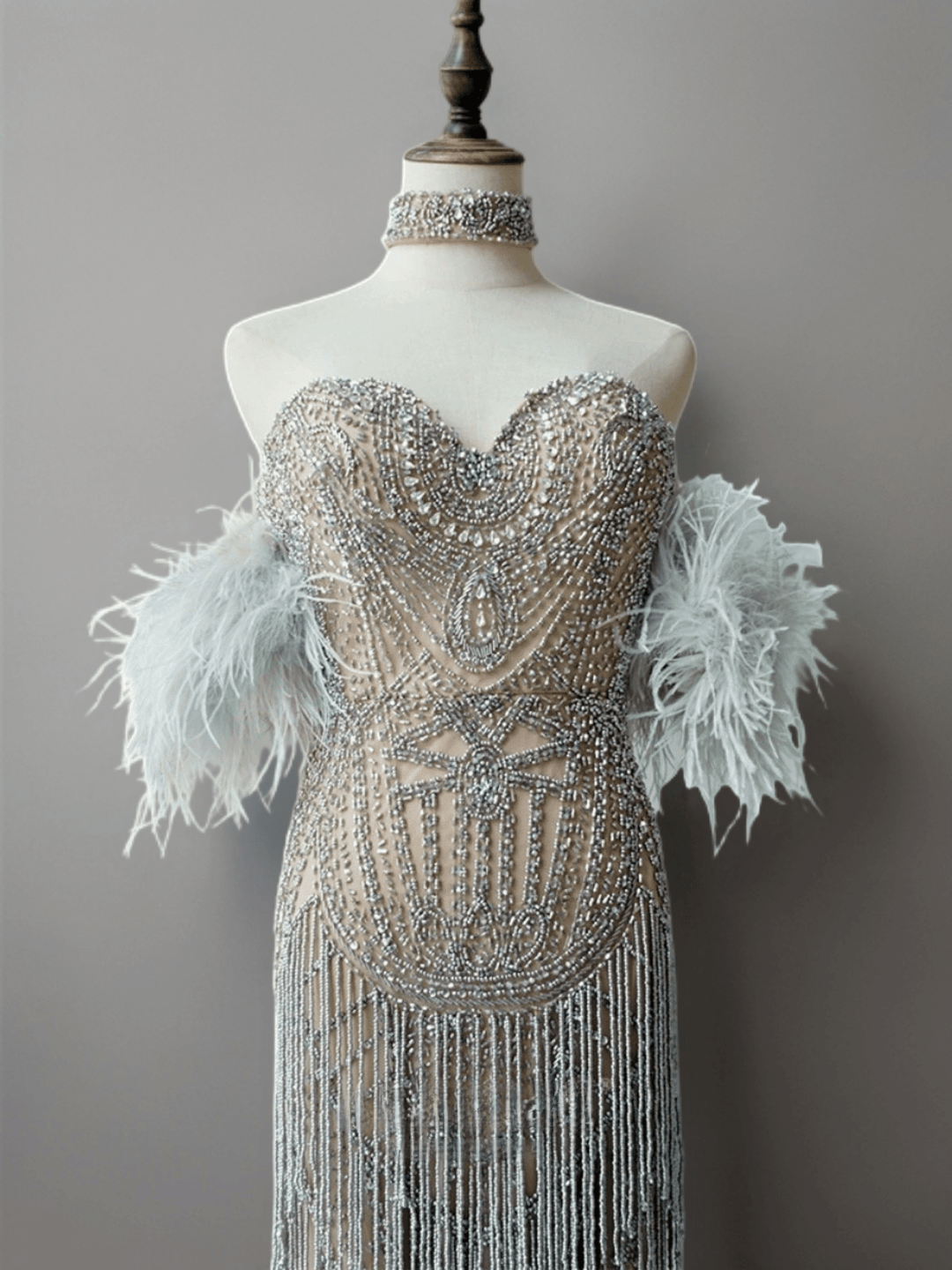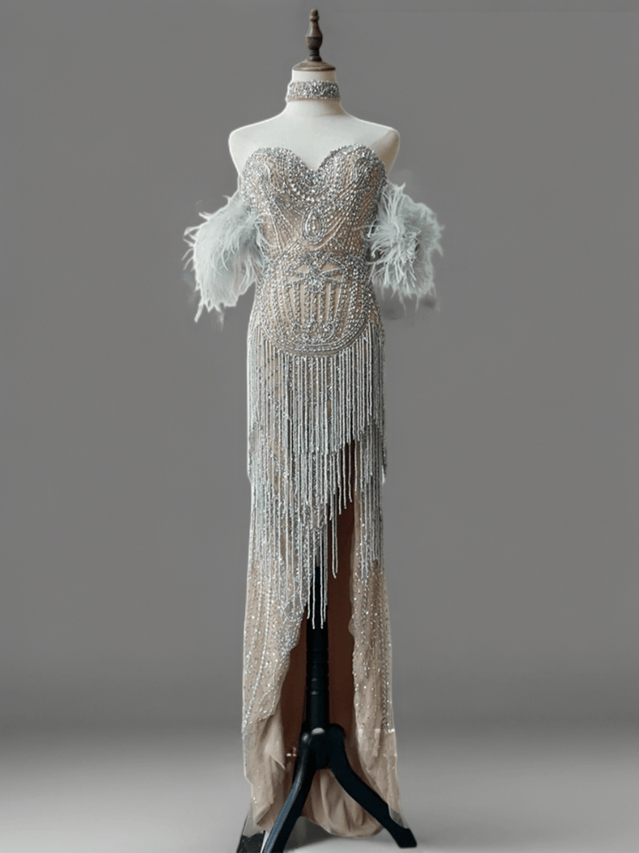 The sweetheart neckline elegantly frames the décolletage, while the daring slit adds a modern and alluring twist to the classic silhouette. The intricate beadwork and fringe detailing create a captivating effect, ensuring you sparkle with every step.