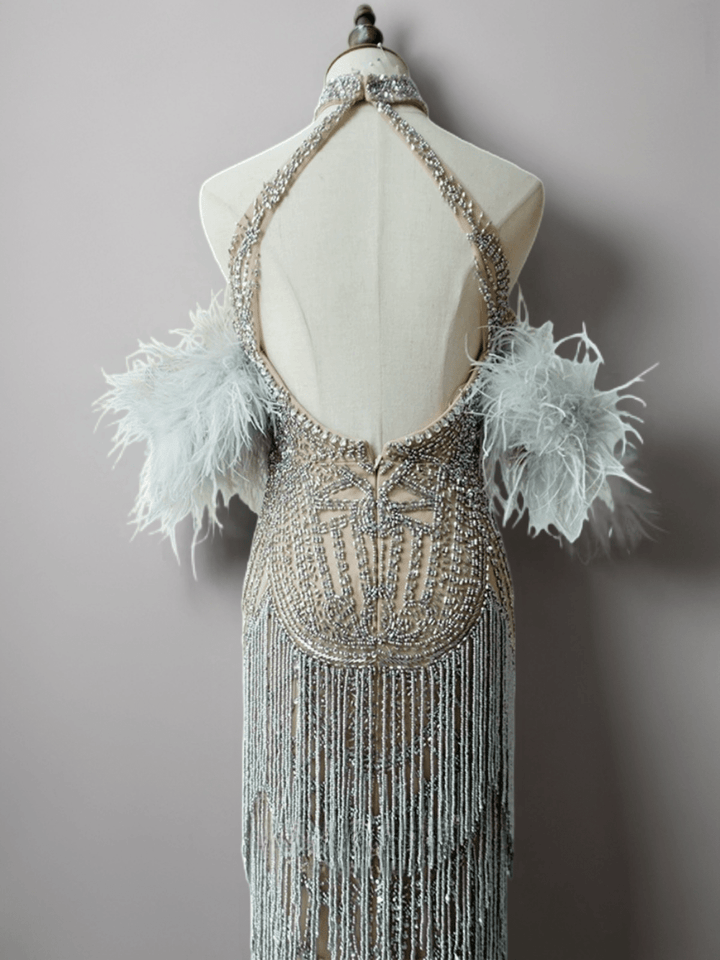 Turn heads with the stunning Champagne Sequin and Feather Bridal Gown. This off-shoulder silver evening dress is perfect for making a grand entrance. The gown features intricate sequin detailing that shimmers beautifully, complemented by luxurious feather accents on the sleeves for a touch of drama.