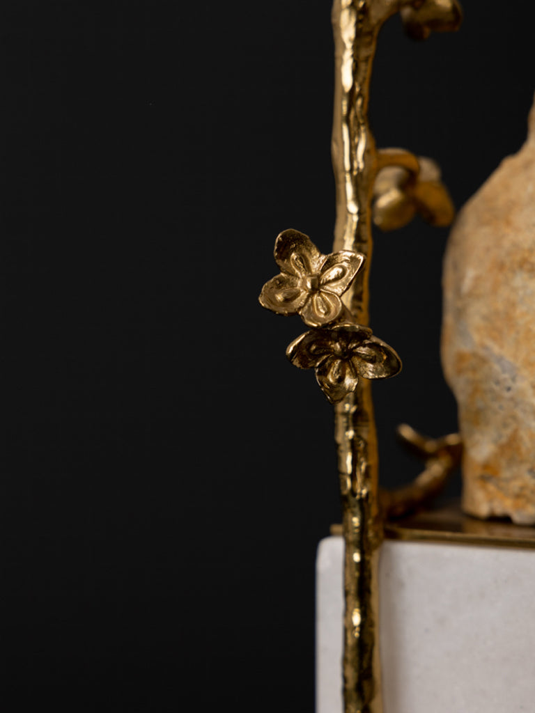 Hand-forged with artisanal precision, the Oriental Golden Brass and Blue Crystal Bird Sculpture on Marble Base embodies both natural elegance and symbolic grace. A finely detailed golden bird perches upon a blossoming branch, its wings shimmering with rich brass texture, while a raw-cut blue crystal rises like a serene mountain beneath. Each crystal is naturally formed, carrying subtle variations that make every piece truly one of a kind.